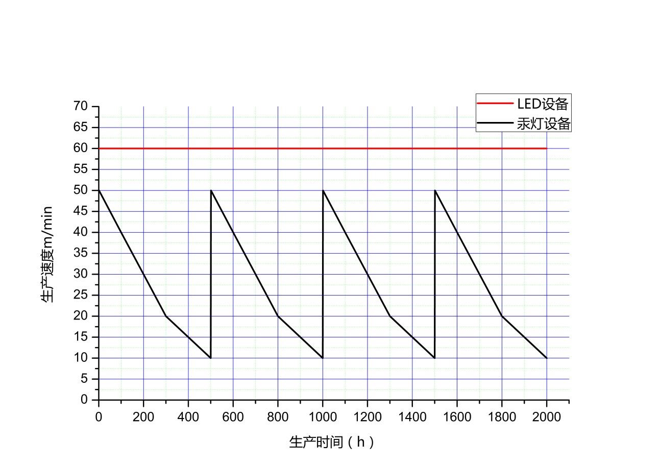 汞燈輻照設(shè)備與LED輻照設(shè)備生產(chǎn)速度曲線對比