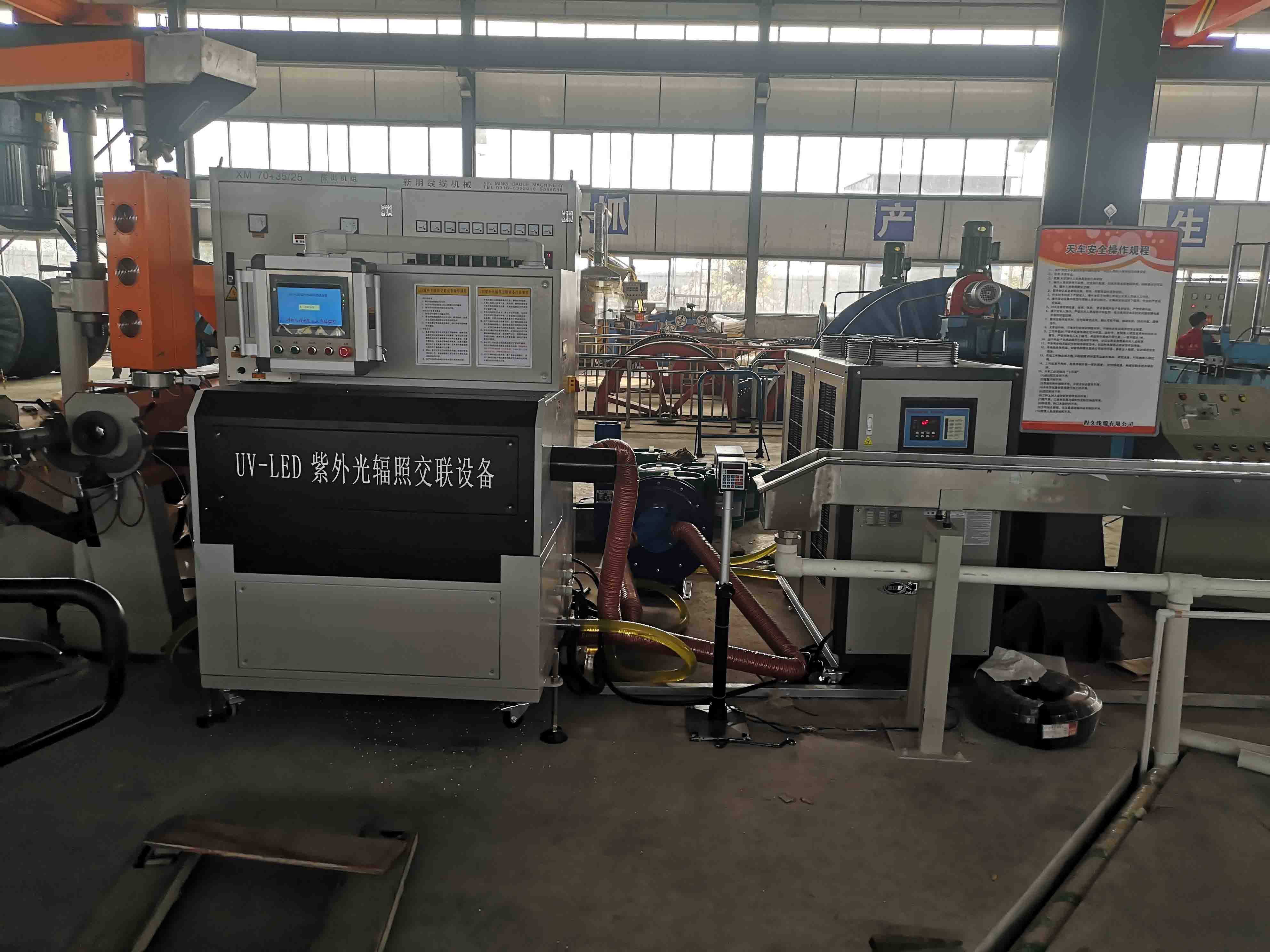 新型LED紫外光輻照聚烯烴交聯(lián)設(shè)備采用新工藝LED燈耗電量比老款輻照省70%,交聯(lián)速度是原來的2倍以上,新產(chǎn)品解決了絕緣厚輻照不透的缺點和速度慢的缺點,占地少,設(shè)計更合理,省去了蒸汽交聯(lián)工序,大大提高了生產(chǎn)效率。根據(jù)客戶反應(yīng)大大節(jié)約了成本和時間。